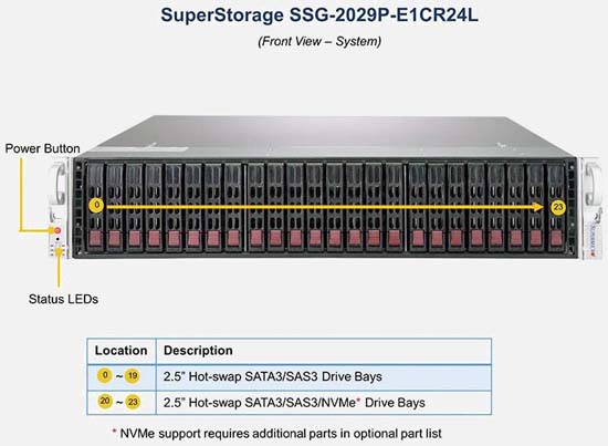 The Supermicro SuperStorage 2029P-E1CR24L | SSG-2029P-E1CR24L supports the Intel Intel Xeon Scalable Processors 2nd Generation family in a high-density 2U form-factor. These SuperServers are ideal for network infrastructure, front-end enterprise, and minimal-downtime cluster server systems.