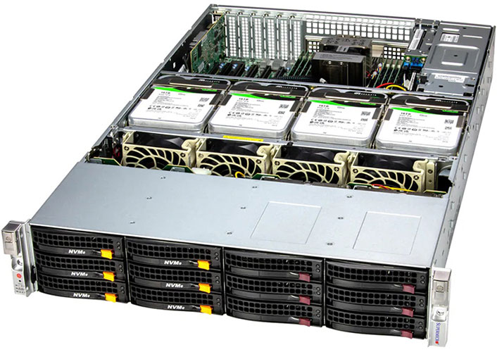 Ideal for HPC, Data Center, enterprise server. 4x PCIe 5.0 x16 LP slot & 2x PCI-E 5.0 x8 LP slots. Redundant 1600W Power Supply, 16x 3.5" hot-swap SATA/SAS/6x NVMe Hybrid drive bays.