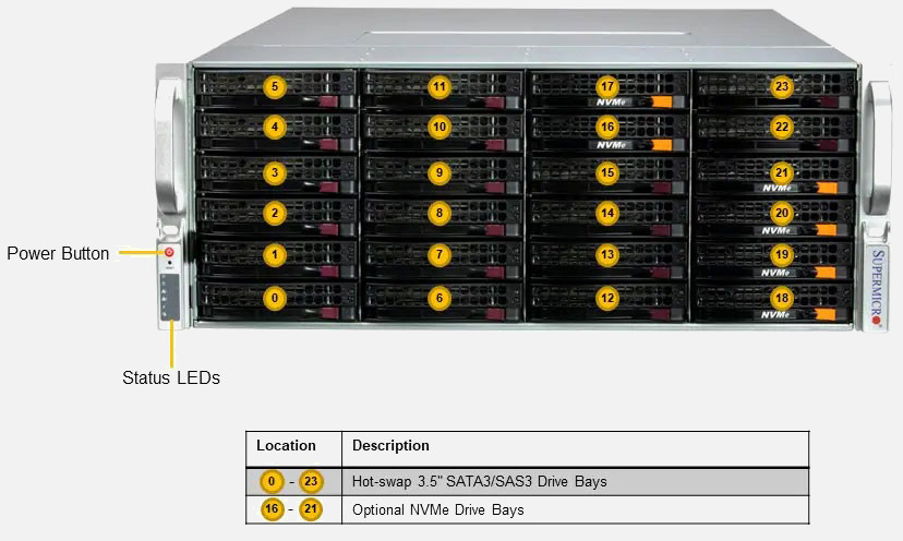 The Supermicro Storage SuperServer 641E-E1CR24L | SSG-641E-E1CR24L features hot-swap hard drives, giving you more flexibility and allowing you to remove drives without having to shut down the system.