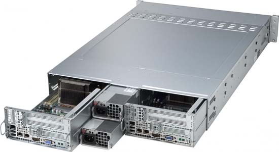This 2U Twin delivers an innovative architecture where devices can be hot-swapped to allow for easier maintenance, to reduce/eliminate down time and to save space and energy.