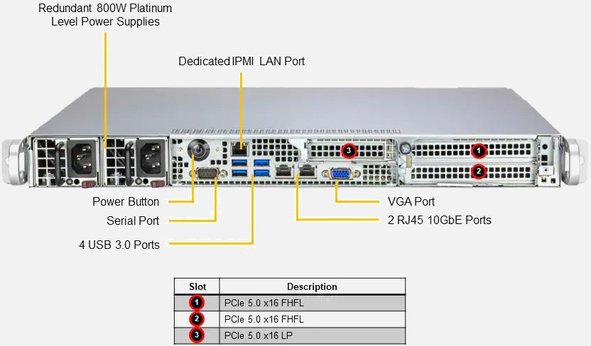 Ideal for Virtualisation, Edge/Cloud Computing Services server. Supports 1x Dual-Slot GPU Card. 2x PCIe 5.0 x16 FHFL & 1x PCIe 5.0 x16 LP, 800W Redundant power supply, 2x 2.5" NVMe/SATA/SAS internal drive bays.