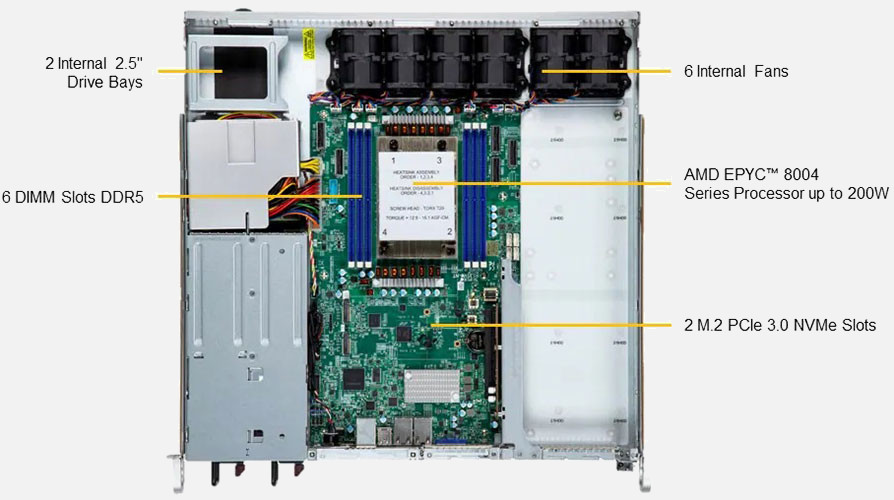 A 1U Supermicro SuperServer based on 1x AMD AMD EPYC 8004 Series range of processors, the Supermicro IoT A+ Server 1115S-FWTRT | AS-1115S-FWTRT is configurable with up to 2x Fixed Drives drive bays, and designed for optimal performance with 6x 4800Mhz DDR5 memory sockets .