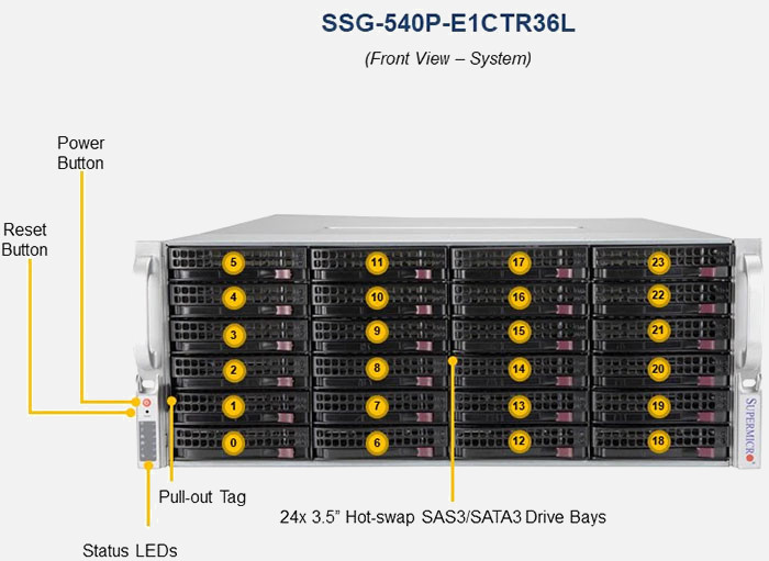 The Supermicro UP Storage SuperServer SSG-540P-E1CTR36L | SSG-540P-E1CTR36L features hot-swap hard drives, giving you more flexibility and allowing you to remove drives without having to shut down the system.