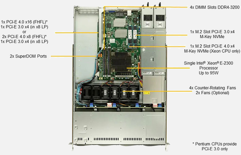 Single Intel Xeon E-2300 series Processor, Ideal for virtualisation, cloud computing, enterprise server. 1x PCI-E 4.0 x16 slots, 1x PCI-E 3.0 x8 Slot. Redundant Platinum 500W Power Supply, 4x 3.5/2.5" SATA/SAS drives
