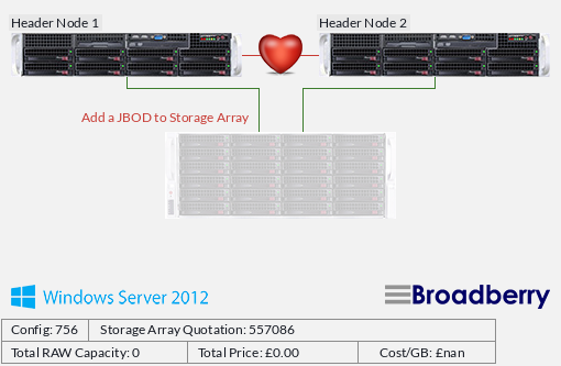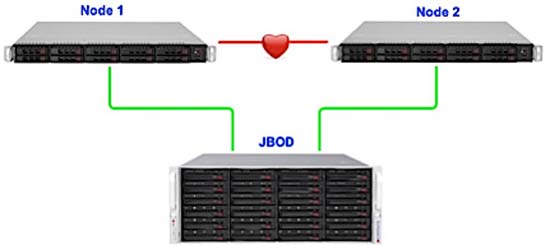 Each clustered server (referred to as a 'node') are connected by external SAS cables and the Windows Storage Server 2012 software. In event of one of these nodes failing another node takes over in providing the service with very little disruption to the uers, this is known as failover.