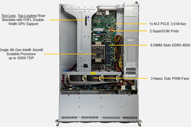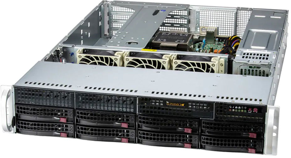 Supports 1x double slot GPU card, 5th/4th Gen Intel Xeon Scalable processor, dual 1Gb/s LAN ports, redundant power supply, 8x 3.5" NVMe/SATA hot-swappable bays